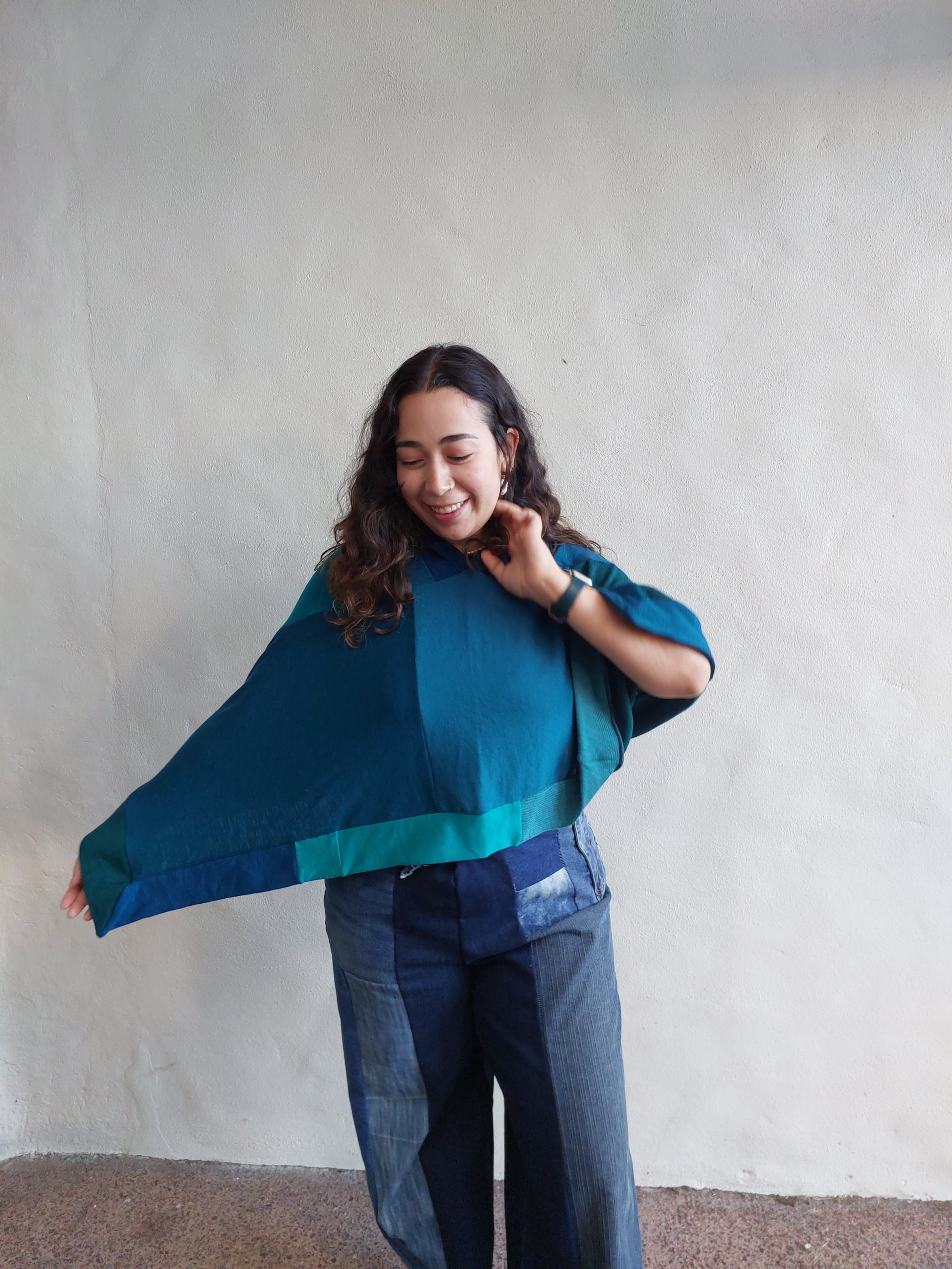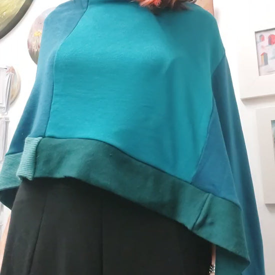 Flawlessly handmade from ♻ upcycled merino wool, this pretty asymmetric poncho features lovely shades of deep tourquise, teal aqua blue/ greens in a patchwork style design.