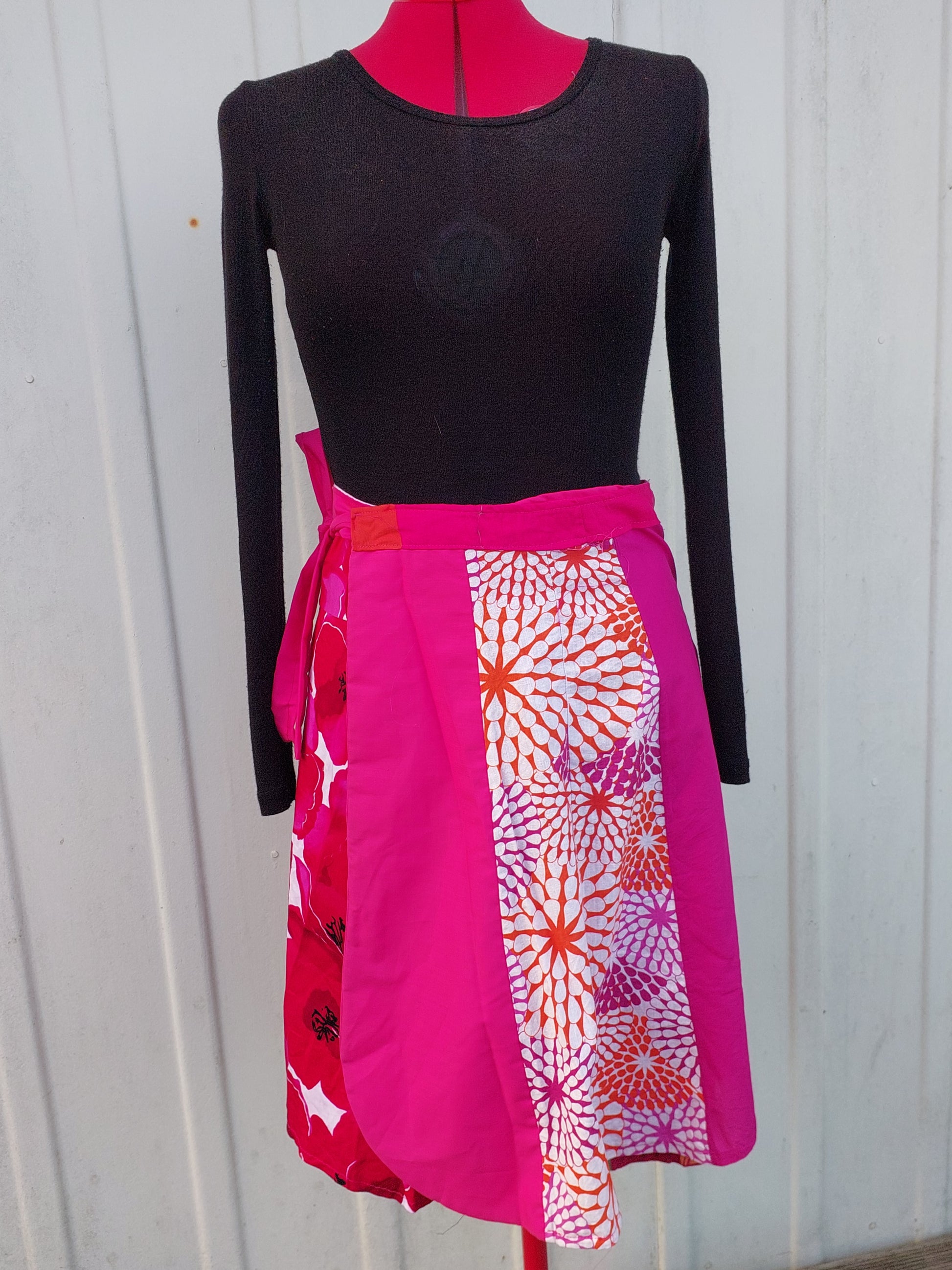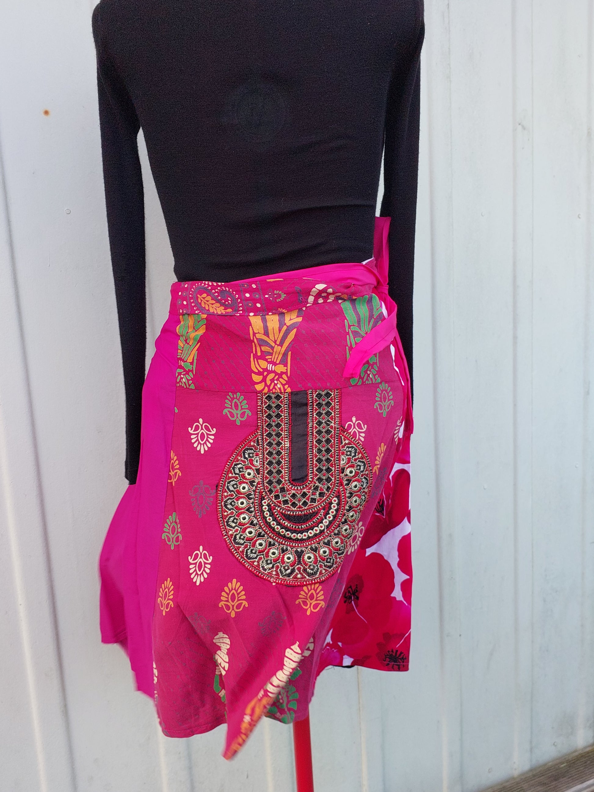 pink upcycled wrap skirt, Indian print, Marimekko print