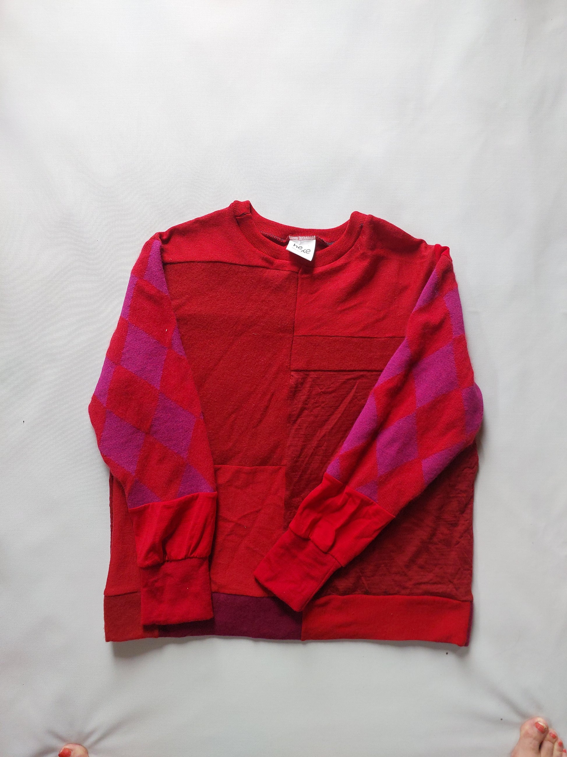 Flawlessly handmade from ♻ upcycled merino wool, this unisex pullover features lovely shades of paprika, merlot and dark purple diamond sleeves in a bold patchwork style design.