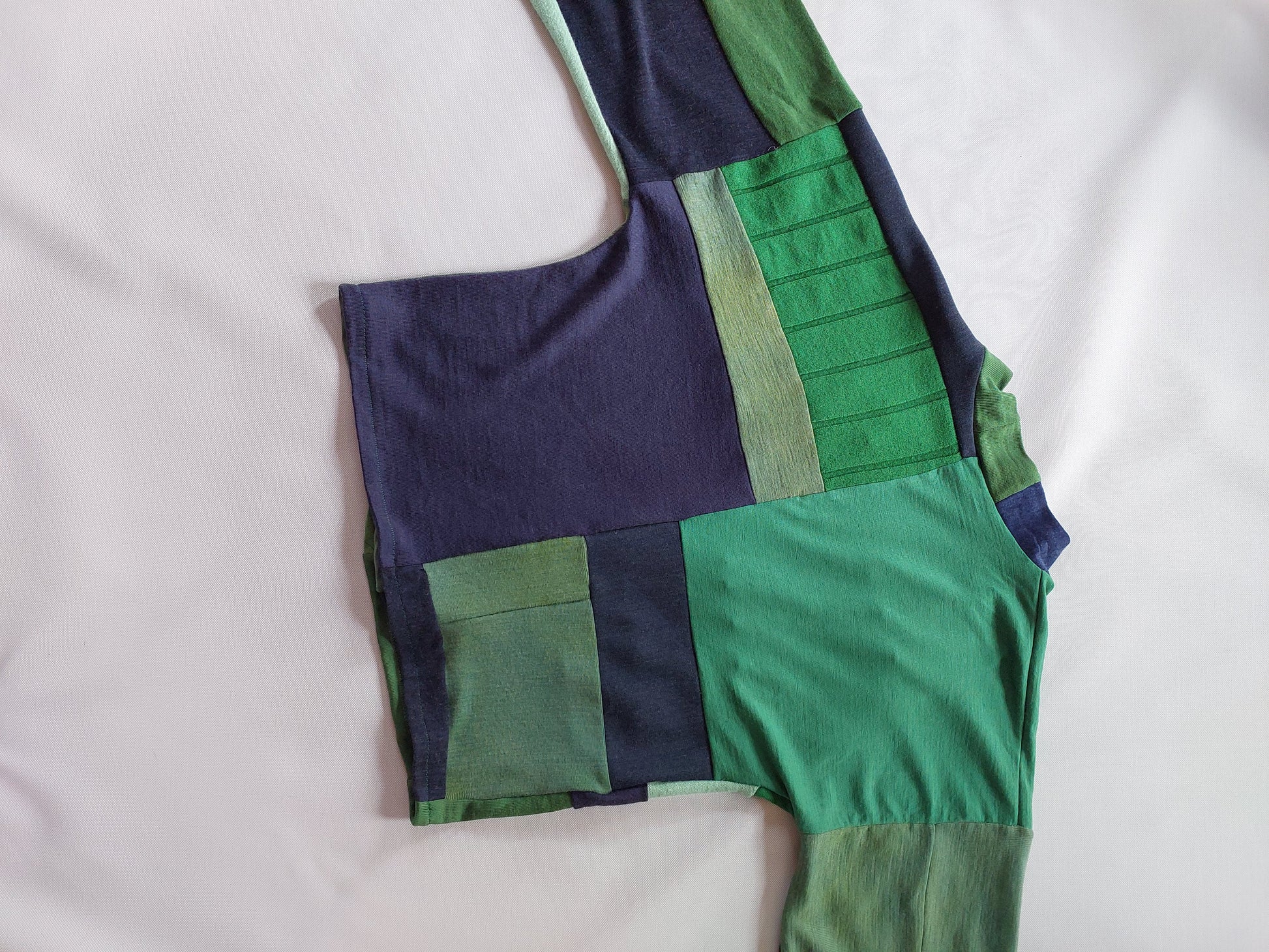 ⚬ Squares and strips are pieced together with a folded band along the front and neck.